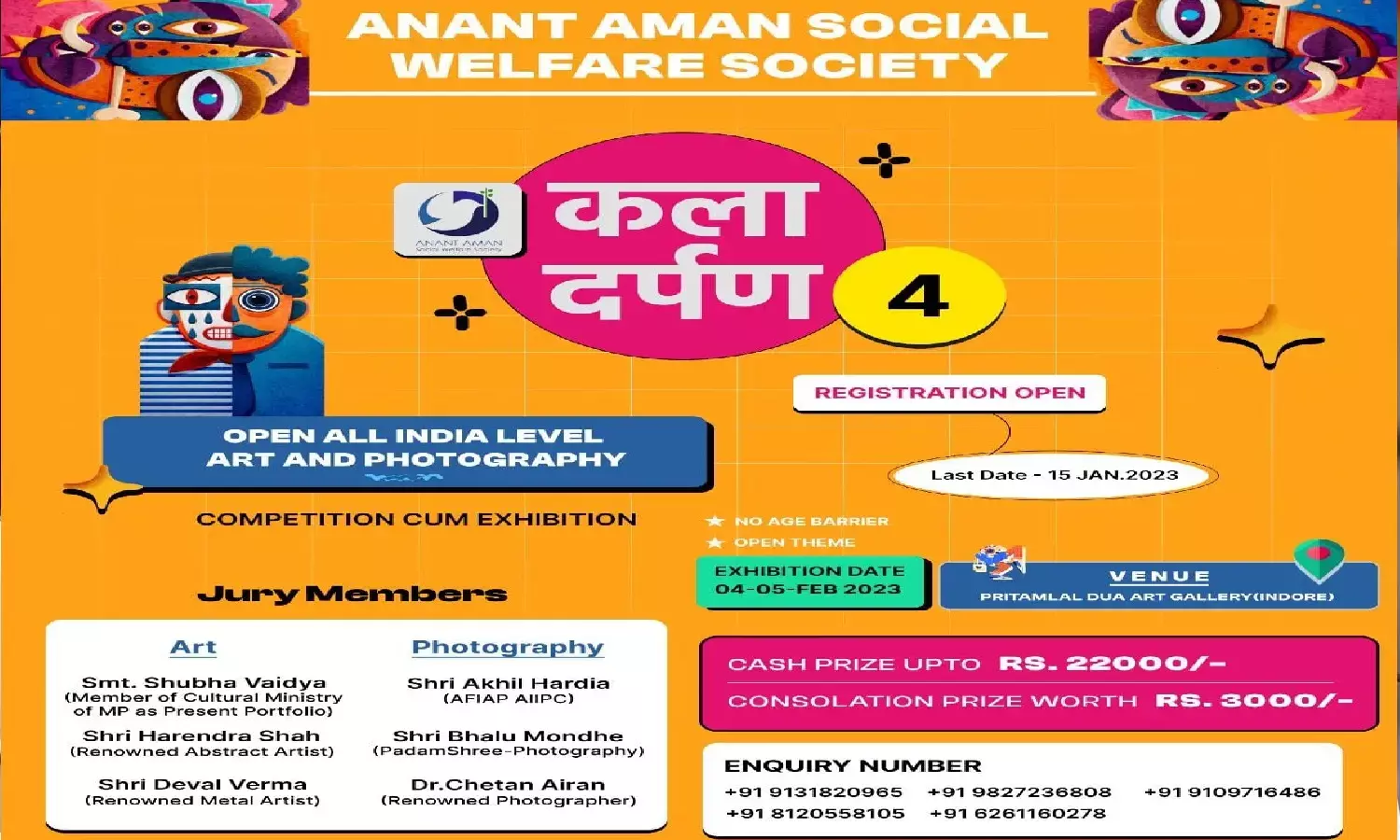 Indore: लोगो के पास कला तो कूट कूट भरी हुई है, लेकिन कलाकारों को अपनी कला दिखाने के लिए मंच नही मिल पाता। इसी विषय को ध्यान में रखते हुए हर वर्ष की तरह इस वर्ष भी इंदौर की संस्था अनंत अमन सोसायटी कलाकारों के लिए लेकर आई है एक शानदार कलामंच, जो कि पिछले 8 सालों से कलादर्पण नाम से मशहूर है। यह प्रदर्शनी 04 और 05 फरवरी को इंदौर शहर में आयोजित होने जा रही है।