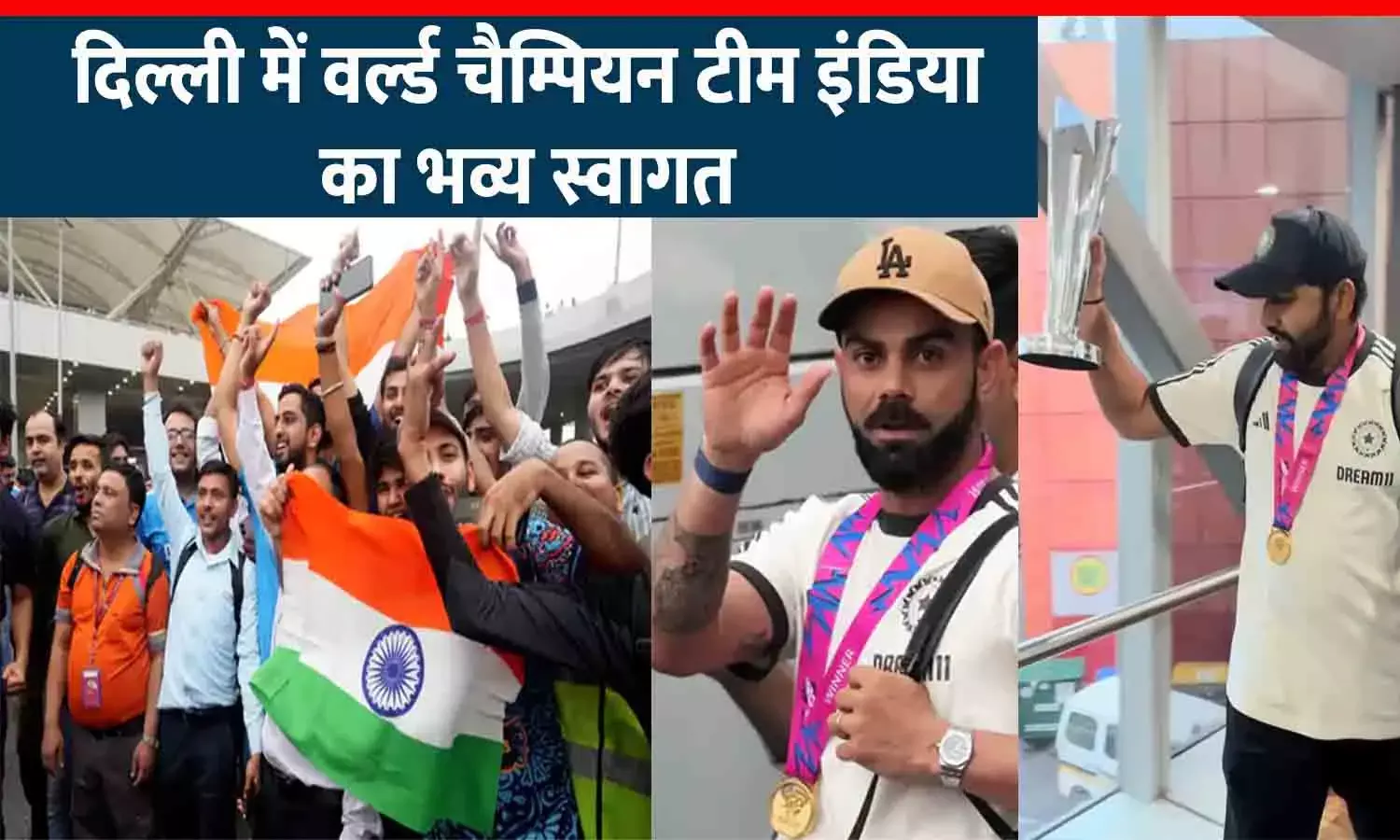 भारत पहुँचने पर T20 वर्ल्ड कप विजेता भारतीय क्रिकेट टीम का आज दिल्ली में शानदार स्वागत किया गया। 3 दिनों तक बारबाडोस में तूफान के कारण फंसी टीम को BCCI द्वारा भेजे गए स्पेशल विमान 'चैंपियंस 24 वर्ल्ड कप' से दिल्ली लाया गया। इंदिरा गांधी अंतरराष्ट्रीय हवाई अड्डे पर पहुंचने पर टीम का भव्य स्वागत किया गया। उत्साही प्रशंसक सुबह 5 बजे से ही टीम के इंतजार में थे। "भारत माता की जय" और "रोहित-विराट" के नारे गूंज रहे थे।