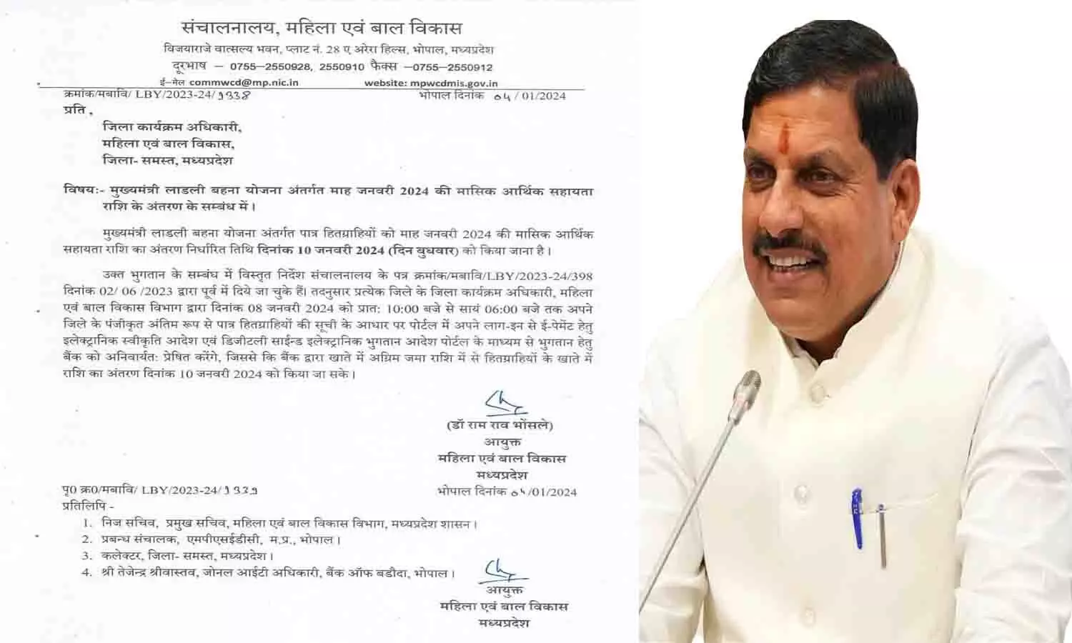 लाड़ली बहना योजना की 7 राशि महिलाओ के अकाउंट में भेज दी गई है. वही आठवीं राशि भी इसी महीने महिलाओ के अकाउंट में डाली जानी है. आदेश के मुताबिक इस बार भी 10 तारीख को बहनों के खाते में राशि आ जाएगी। बता दें कि चार जनवरी को महिला एवं बाल विकास आयुक्त डॉ राम राव भोंसले के हस्ताक्षर से एक आदेश सामने आया है। इसमें सभी जिला कार्यक्रम अधिकारी औप महिला बाल विकास अधिकारियों को कहा गया है कि 8 जनवरी 2024 तक अपने जिले के पंजीकृति लाभार्थियों की सूची के आधार पर पोर्टल में अपने लॉग इन से ई-पेमेंट के लिए स्वीकृति प्रदान करें। इसके बाद लाभार्थियों के खाते में 10 जनवरी 2024 को राशि ट्रांसफर की जाएगी।