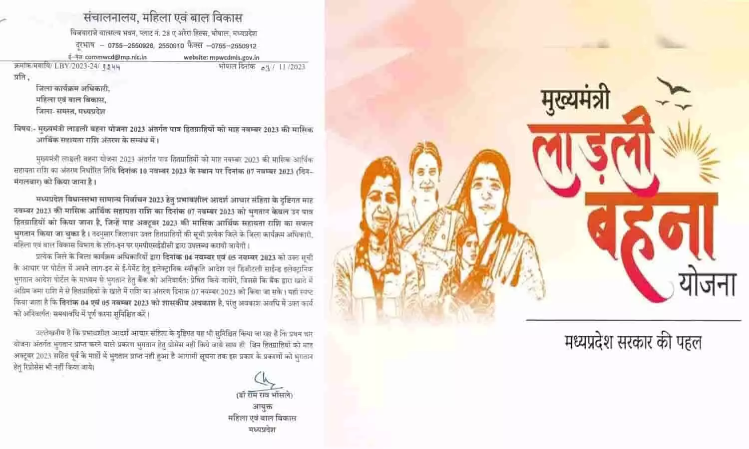 मध्यप्रदेश विधानसभा सामान्य निर्वाचन 2023 हेतु प्रभावशील आदर्श आचार संहिता के दृष्टिगत माह नवम्बर 2023 की मासिक आर्थिक सहायता राशि का दिनांक 07 नवम्बर 2023 को भुगतान केवल उन पात्र हितग्राहियों को किया जाना है, जिन्हें माह अक्टूबर 2023 की मासिक आर्थिक सहायता राशि का सफल भुगतान किया जा चुका है। तदनुसार जिलावार उक्त हितग्राहियों की सूची प्रत्येक जिले के जिला कार्यक्रम अधिकारी, महिला एवं बाल विकास विभाग के लॉग-इन पर एमपीएसईडीसी द्वारा उपलब्ध करायी जायेगी।