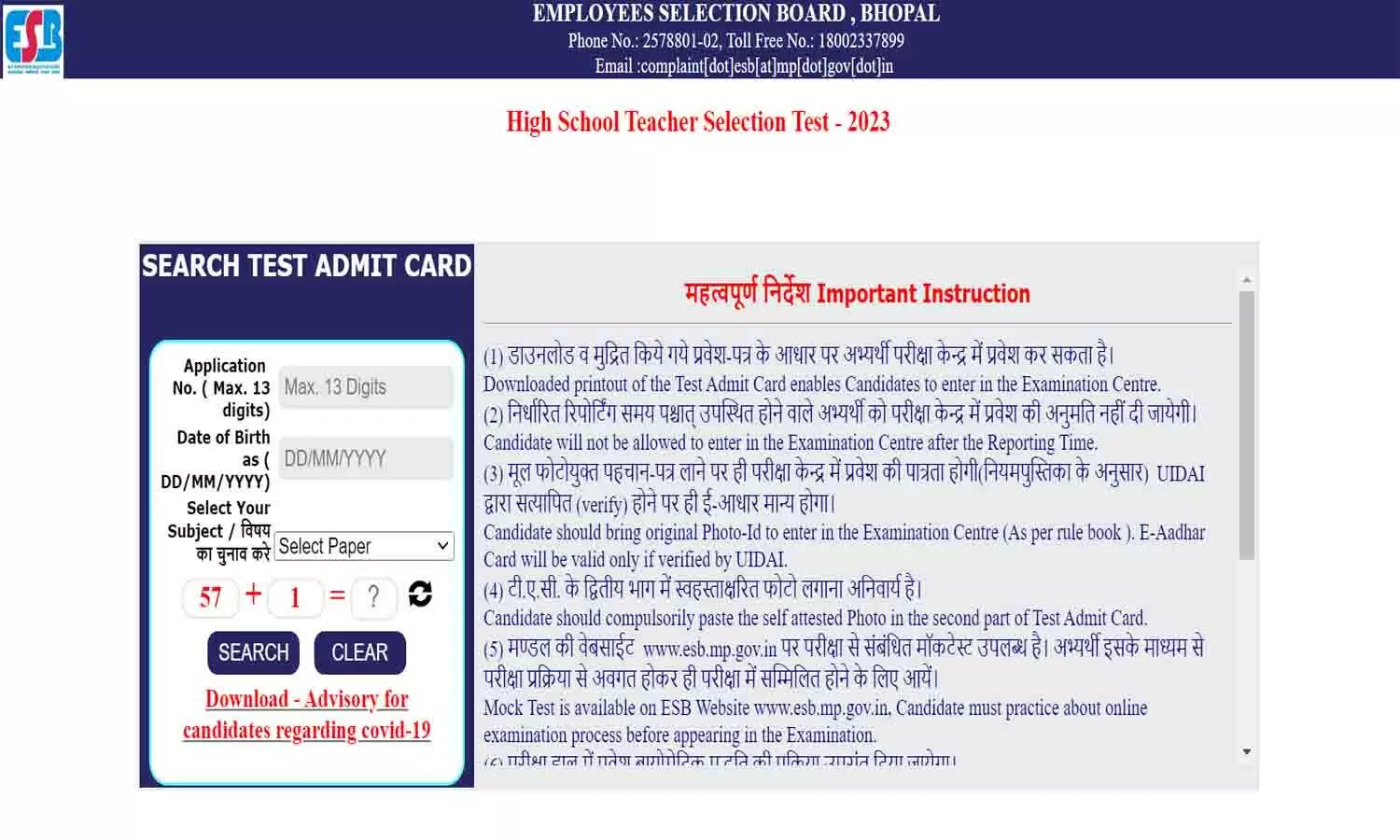 Madhya Pradesh Employees Selection Board ने जारी किया हाई स्कूल शिक्षक चयन परीक्षा का एडमिट कार्ड, esb.mp.gov.in पर जाकर डाउनलोड करे