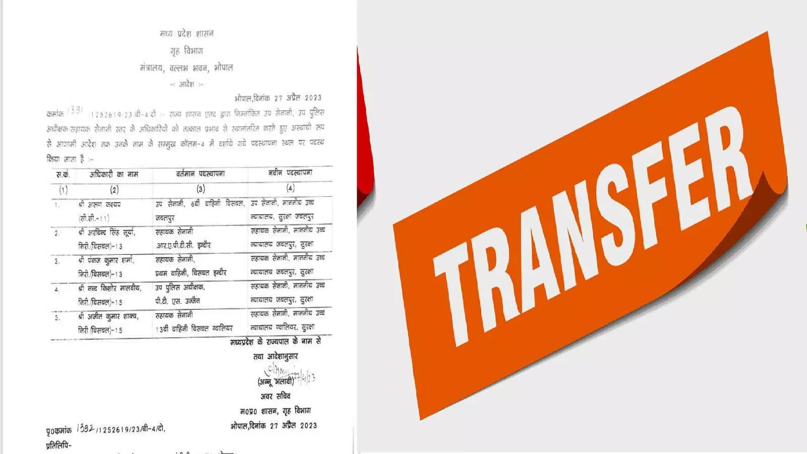 MP DSP Transfer 2023 News: मध्य प्रदेश से बड़ी खबर सामने आ रही है। मध्य प्रदेश गृह विभाग द्वारा उप सेनानी, उप पुलिस अधीक्षक सहायक सेनानी स्तर के अधिकारियों को वर्तमान पदस्थापना से स्थानांतरित करते हुए नवीन पदस्थापना के आदेश जारी किए गए हैं। जिन अधिकारियों का ट्रांसफर किया गया है उनमे अरूण कश्यप, अरविन्द सिंह सूर्या, पंकज कुमार शर्मा, नन्द किशोर मालवीय, अजीत कुमार शाक्य शामिल हैं।