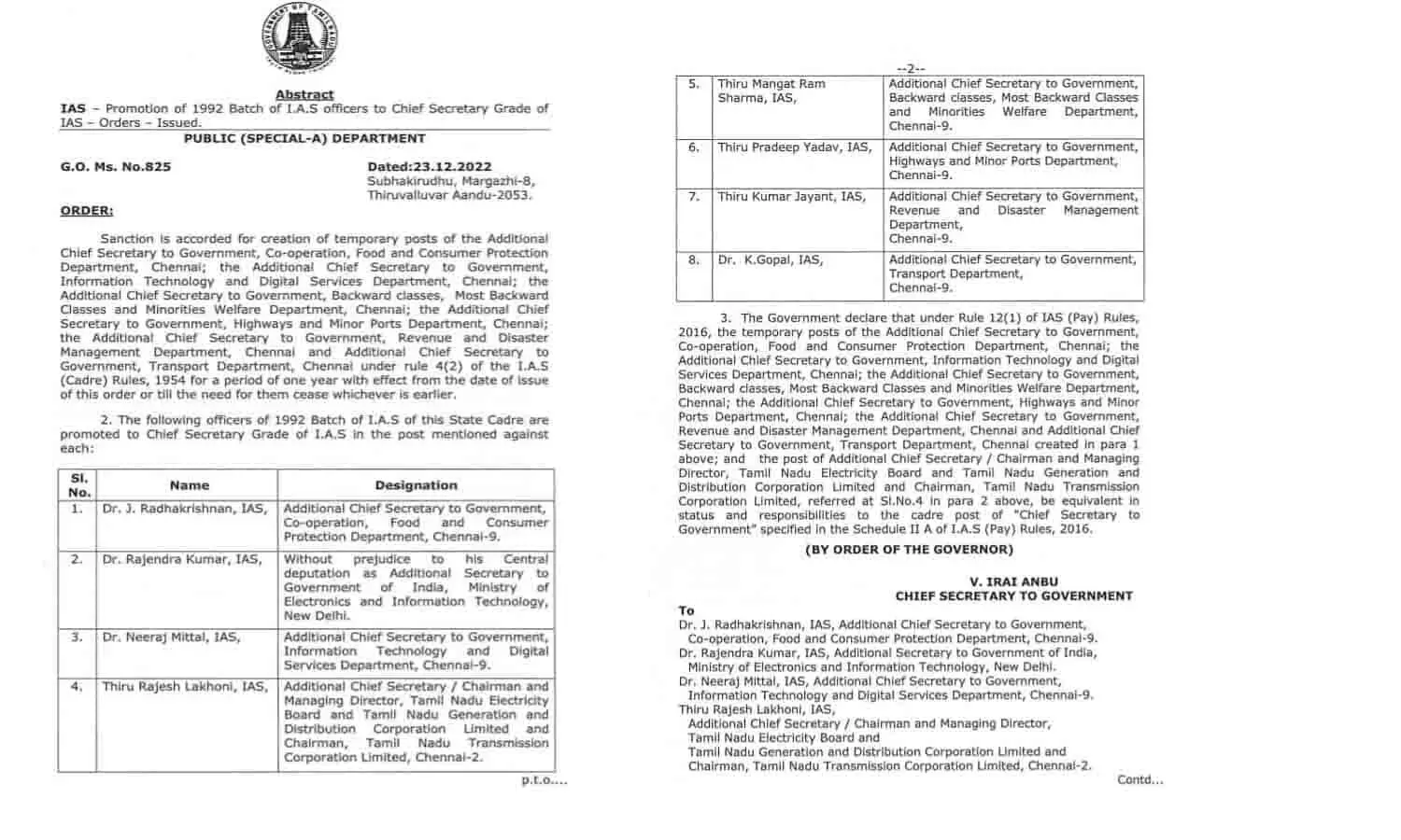 आईएएस जे राधाकृष्ण को अतिरिक्त मुख्य सचिव सहकारिता खाद्य और उपभोक्ता संरक्षण विभाग के पद पर पदोन्नति दी गई है। आईएएस मंगतराम शर्मा को अल्पसंख्याक कल्याण विभाग में पदस्थ किया गया।