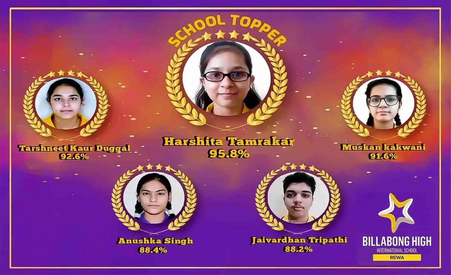 सीबीएसई कक्षा -10 बोर्ड के अंतिम परिणाम शुक्रवार 22 जुलाई 2022 को घोषित किए गए, जहां बिलाबोंग हाई इंटरनेशनल स्कूल रीवा (Billabong High International School Rewa) के छात्रों ने अपना सर्वश्रेष्ठ प्रदर्शन किया. स्कूल प्रबंधन अपने कर्मचारियों, छात्रों और प्रत्येक सहायक माता-पिता को 100% परिणाम प्राप्त करने के लिए बधाई देता है. बेस्ट परफॉर्मर हर्षिता ताम्रकर ने 95.8%, तरशनीत कौर दुग्गल ने 92.6% और मुस्कान काकवानी ने 91.6% स्कोर किया.