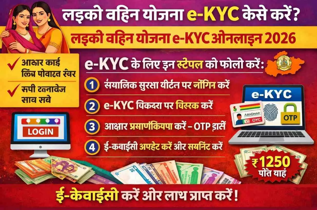 Ladki Bahin Yojana e-KYC ऑनलाइन करने का आसान तरीका यहाँ देखें। बैंक खाता आधार से लिंक करें और ₹1500 की अगली किस्त पाने के लिए अपनी KYC प्रक्रिया तुरंत पूरी करें।