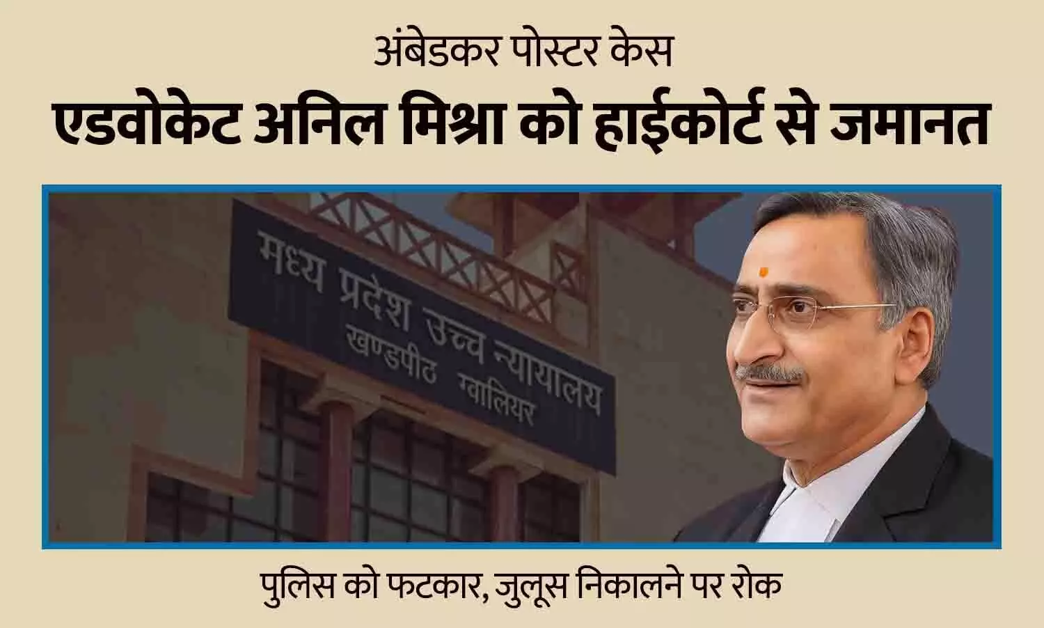 ग्वालियर. डॉ. भीमराव अंबेडकर का पोस्टर जलाने से जुड़े मामले में गिरफ्तार एडवोकेट अनिल मिश्रा को मध्यप्रदेश हाईकोर्ट ने जमानत दे दी है। कोर्ट ने उन्हें ₹1 लाख के निजी मुचलके और ₹1 लाख की जमानत राशि पर रिहा करने का आदेश दिया। साथ ही अदालत ने मामले में पुलिस द्वारा अपनाई गई प्रक्रिया पर गंभीर आपत्तियां दर्ज कीं।