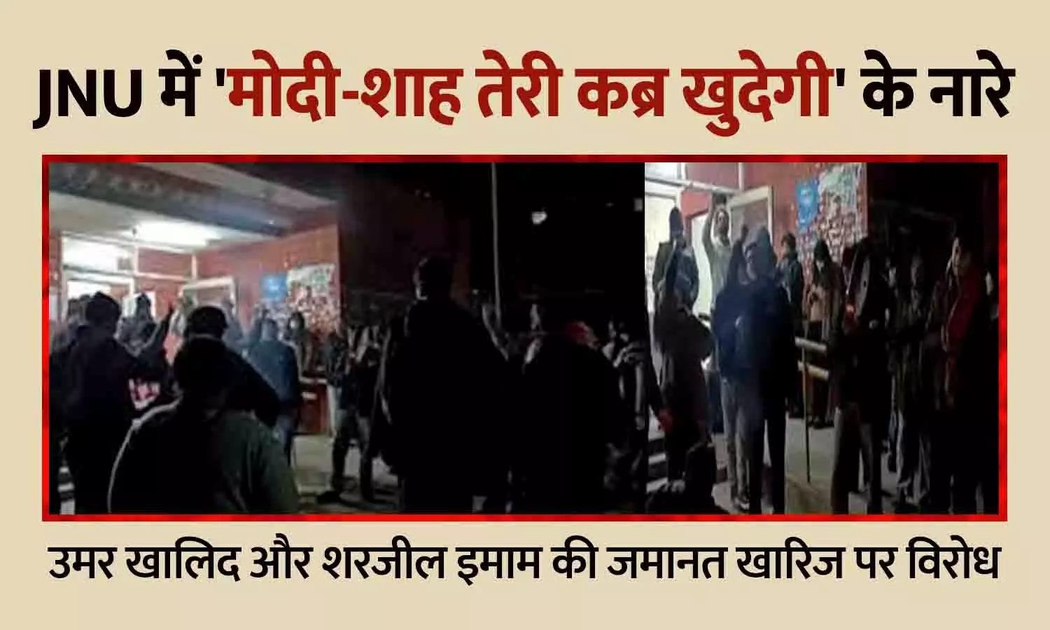 JNU कैंपस में 'मोदी-शाह की कब्र खुदेगी' नारेबाजी का वीडियो सामने आया। बताया गया कि कुछ छात्र उमर खालिद और शरजील इमाम की जमानत याचिका खारिज होने का विरोध कर रहे थे। JNUSU अध्यक्ष ने कहा—प्रदर्शन 2020 हिंसा की निंदा के लिए था।