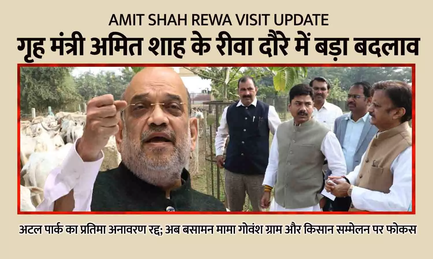 रीवा. केंद्रीय गृह मंत्री अमित शाह के प्रस्तावित रीवा दौरे को लेकर अंतिम समय में बड़ा बदलाव किया गया है। 25 दिसंबर को शहर के अटल पार्क में पूर्व प्रधानमंत्री अटल बिहारी वाजपेयी की प्रतिमा के अनावरण का कार्यक्रम अब प्रशासनिक कारणों से रद्द कर दिया गया है। संशोधित कार्यक्रम के अनुसार अब गृह मंत्री का पूरा फोकस बसामन मामा गोवंश ग्राम और वहां आयोजित किसान सम्मेलन पर रहेगा।