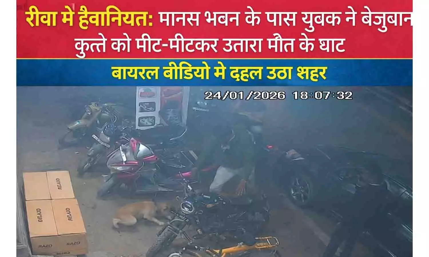 रीवा, मध्य प्रदेश मध्य प्रदेश के रीवा जिले से मानवता को शर्मसार कर देने वाला एक सनसनीखेज मामला सामने आया है। यहाँ एक युवक ने क्रूरता की सारी हदें पार करते हुए एक बेजुबान कुत्ते की बड़ी ही बेरहमी से हत्या कर दी। शहर के व्यस्ततम इलाके मानस भवन के पास हुई इस घटना का वीडियो सोशल मीडिया पर जंगल की आग की तरह फैल रहा है। जिसने भी यह वीडियो देखा, उसकी रूह कांप गई।