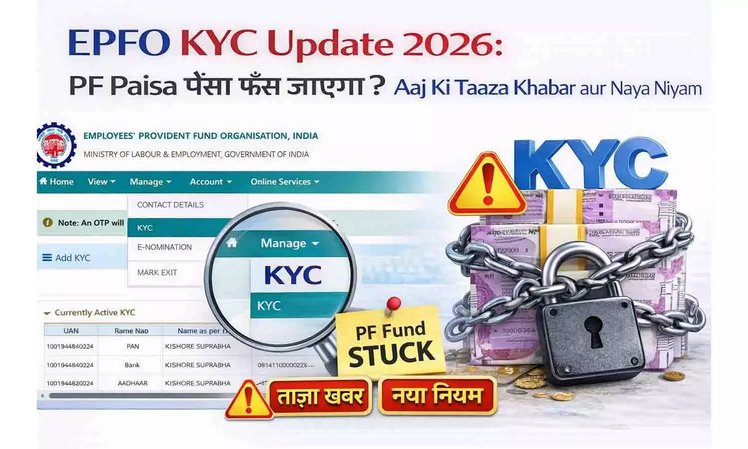 EPFO KYC Update 2026 की ताज़ा खबर! क्या आपका आधार और बैंक लिंक है? नई डिजिटल प्रक्रिया, रिजेक्शन से बचने के उपाय और आज की बड़ी अपडेट यहाँ अभी विस्तार से विस्तार से पढ़ें।