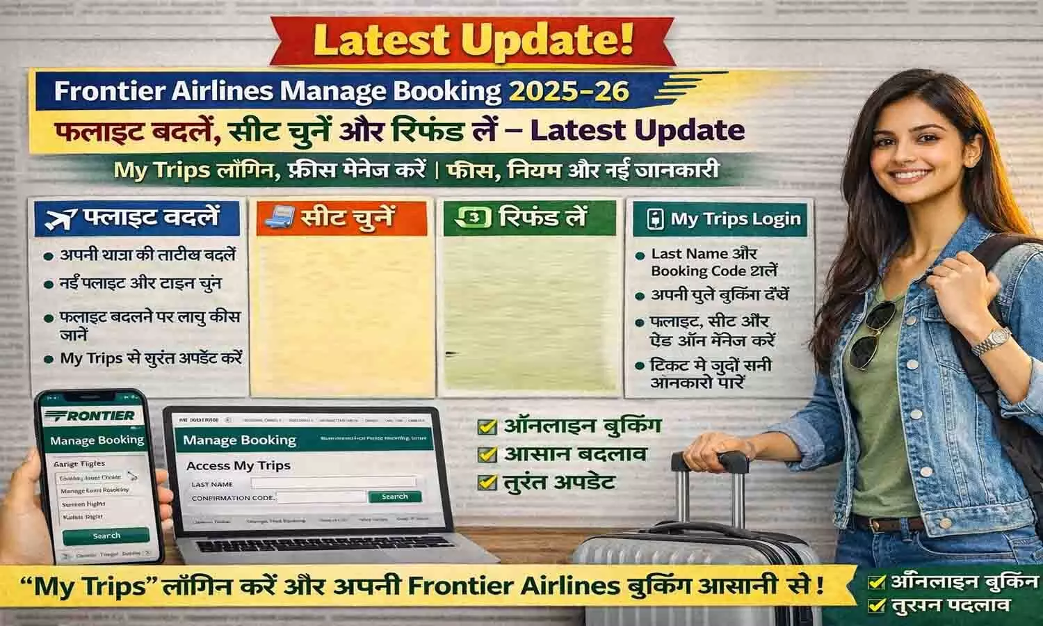 Frontier Airlines Manage Booking 2025–26 यात्रियों के लिए एक बेहद उपयोगी ऑनलाइन सुविधा है, जिसकी मदद से आप अपनी फ्लाइट से जुड़ी लगभग हर जानकारी खुद मैनेज कर सकते हैं। अमेरिका की मशहूर अल्ट्रा लो-कॉस्ट एयरलाइन 2025–26 के लिए अपने Manage Booking (My Trips) सिस्टम को और आसान व तेज बना दिया है। अब फ्लाइट बदलना, सीट चुनना या रिफंड स्टेटस चेक करना पहले से कहीं ज्यादा सरल हो गया है।