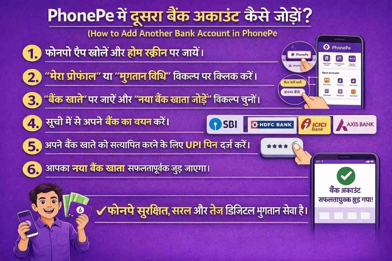 PhonePe में नया बैंक अकाउंट जोड़ना सीखें। स्टेप-बाय-स्टेप गाइड के साथ मल्टीपल बैंक लिंक करें और UPI पेमेंट को आसान बनाएं। तेज़ और सुरक्षित तरीका यहाँ देखें।