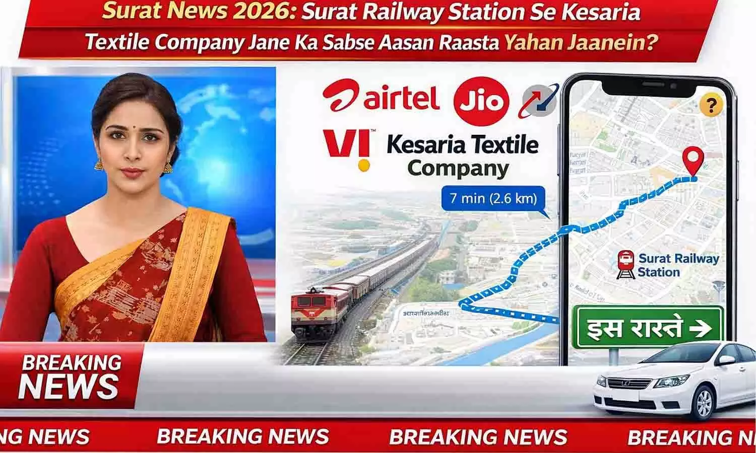 सूरत, जिसे भारत की सिल्क सिटी और टेक्सटाइल हब कहा जाता है, साल 2026 में व्यापार का सबसे बड़ा केंद्र बना हुआ है। यदि आप भी साड़ी या कपड़ा व्यापार शुरू करने की सोच रहे हैं और केसरिया टेक्सटाइल कंपनी (Kesaria Textile Company) जाने का प्लान बना रहे हैं, तो सबसे पहले आपको सूरत रेलवे स्टेशन पहुँचना होगा। स्टेशन से कंपनी तक पहुँचने का रास्ता बहुत ही सरल है, लेकिन पहली बार आने वाले व्यापारियों के लिए कुछ महत्वपूर्ण बातें जानना ज़रूरी है ताकि उनका समय और पैसा दोनों बच सके।