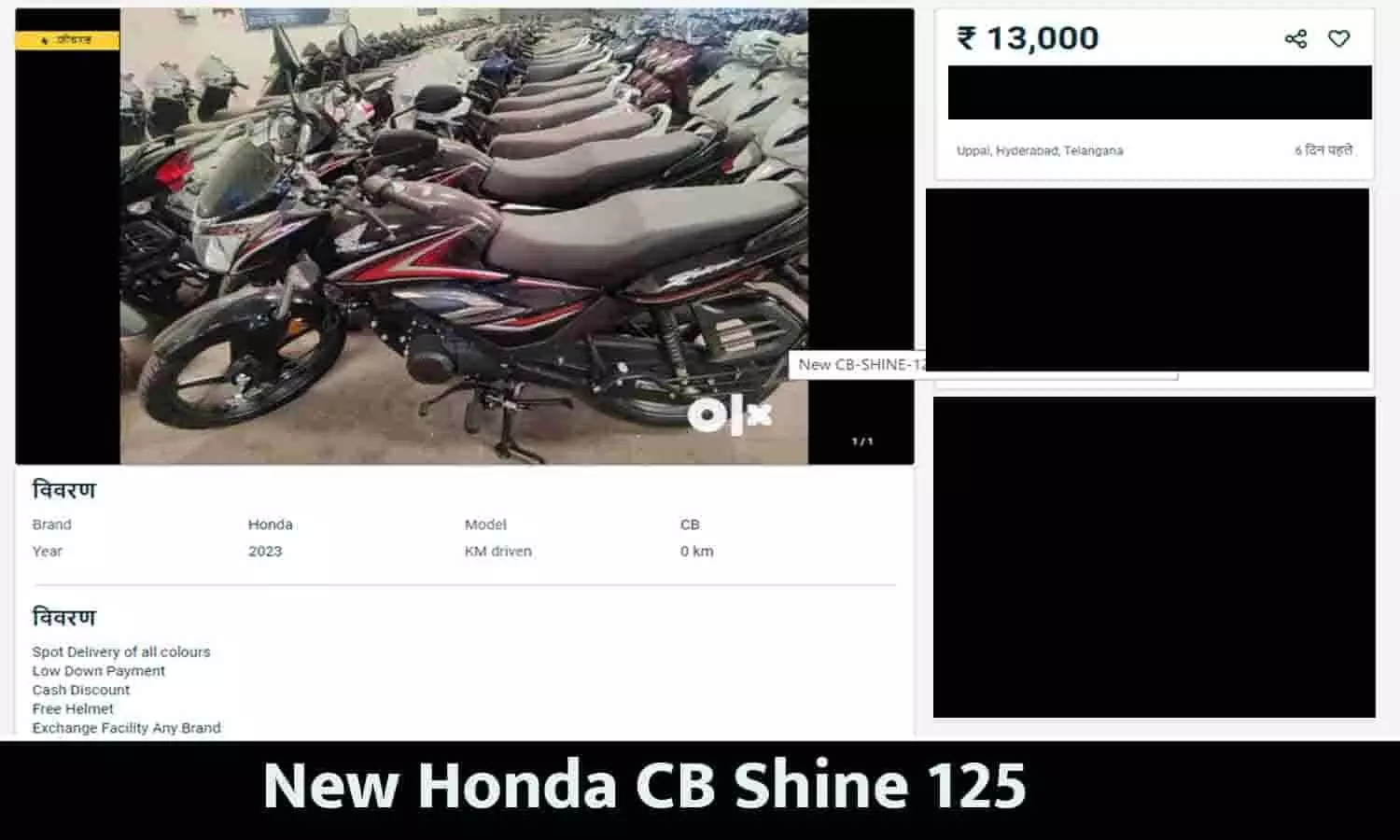 New Honda CB Shine 125 को खरीदने का विचार आप बना रहे है तो ये बाइक आपको OLX वेबसाइट में मिल जाएगी. 13000 रूपए के डाउन पेमेंट करके आप इसे आसानी से अपने घर ला सकते है. ये बाइक उप्पल कंपनी हैदराबाद तेलंगाना की बताई जा रही है. ये बाइक एक दम नई है. और 2023 का मॉडल भी है. इस वेबसाइट में जाकर https://www.olx.in/hi-in आप पूरी जानकारी विजिट कर सकते है.