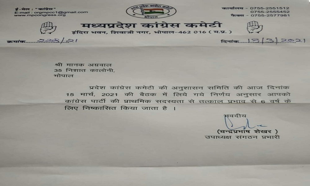 नगरीय निकाय चुनाव के पहले ही कांग्रेस पार्टी में घमासान शुरू हो गया है। मध्यप्रदेश कांग्रेस कमेटी ने वरिष्ठ कांग्रेस नेता मानक अग्रवाल को 6 वर्ष के लिये पार्टी से निष्कासित कर दिया है। सोमवार को हुई अनुशासन समिति की बैठक में यह निर्णय लिया गया है। यह कार्रवाई प्रदेश कांग्रेस कमेटी के उपाध्यक्ष संगठन प्रभारी चंद्रप्रभाष शेखर द्वारा की गई है। इस कार्रवाई के बाद कांग्रेस और अग्रवाल समर्थकों में हड़कम्प मच गया है।