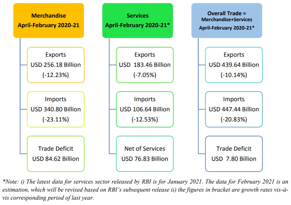ओवरऑल व्यापार संतुलन: समग्र व्यापार (merchandise + services) अप्रैल-फरवरी 2020-21 में अनुमानित व्यापार घाटा USD 7.80 बिलियन है जबकि अप्रैल-फरवरी 2019-20 में USD 75.90 बिलियन का घाटा था।