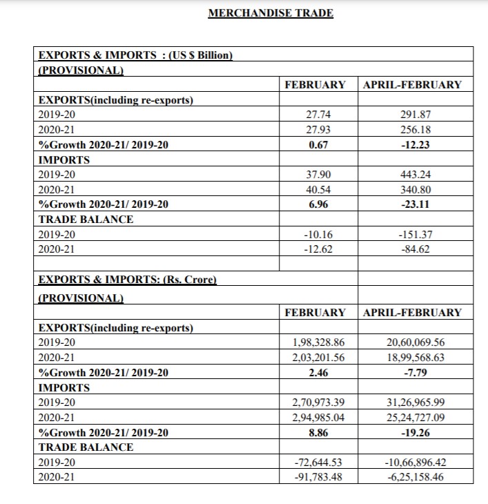 Merchandise: फरवरी 2021 के लिए व्यापार घाटा 12.62 बिलियन अमरीकी डालर आंका गया है जो की फरवरी 2020 में व्यापार घाटे USD 10.16 बिलियन की तुलना में 24.14 प्रतिशत की वृद्धि है।