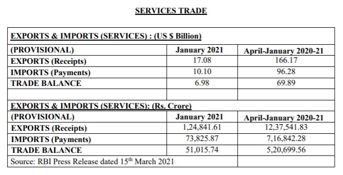 Services: 15 मार्च 2021 को आरबीआई की प्रेस विज्ञप्ति के अनुसार, व्यापार संतुलन जनवरी 2021 के लिए सेवाएं (यानी नेट सेवा निर्यात) USD 6.98 बिलियन है। अनुमानित व्यापार फरवरी 2021 में 6.94 बिलियन अमरीकी डॉलर है।