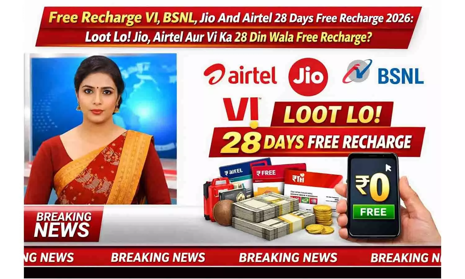 Free Recharge VI, BSNL, Jio And Airtel 28 Days Free Recharge 2026: लूट लो! Jio, Airtel और Vi का 28 दिन वाला फ्री रिचार्ज?
