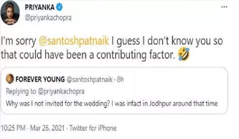 बॉलीवुड से लेकर हॉलीवुड में मशहूर रहने वाली प्रियंका से उनका फैंस काफी नाराज था. जानकारी के मुताबिक एक फैंस ने प्रियंका को ट्विटर में ट्वीट करते हुए लिखा की मै आपसे खासा नाराज हूँ क्योंकि आपने मुझे अपनी शादी में नहीं बुलाया। फैंस ने आगे लिखा की जब आपकी शादी थी तो मै जोधपुर के आसपास ही था. फैंस की शिकायत पर प्रियंका ने जवाब देते हुए कहा की मुझे माफ़ करना मुझे नहीं पता था की आप वहां हो. और मै आपको जानती भी नहीं थी इसलिए आपको नहीं बुलाया। फिर प्रियंका ने हांसे हुए इमोजी शेयर की.