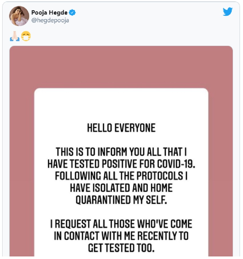 Actress Pooja Hegde हुई कोरोना संक्रमित, पोस्ट में लिखा सभी प्रोटोकाल कर रही हूं पालन