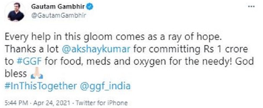 गौतम गंभीर ने अपने ट्वीट में लिखा है कि निराशा में हर मदद उम्मीद की किरण बनकर आती है। जरूरतमंदों को भोजन, दवाओं एवं आॅक्सीजन के लिए गौतम गंभीर फाउडेशन में अक्षय कुमार ने एक करोड़ रूपए दिए है। आगे वह लिखते है कि अक्षय आपका बहुत-बहुत शुक्रिया भगवान आपका भला करें।