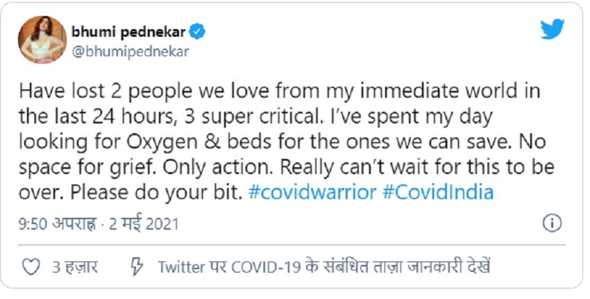 इस मुश्किल समय में बाॅलीवुड सितारों सहित तमाम लोगों ने अपनी तरफ से मदद का हाथ बढ़ाया है। बावजूद इसके कईयों की जान नहीं बच सकी हैं। इसी कड़ी एक्ट्रेस भूमि पेंडनेकर (Bhumi Pednekar) ने एक ट्वीट करके कोरोना को लेकर अपना दर्द बयां किया हैं। उन्होंने बताया कि कैसे 24 घंटे के अंदर कोरोना ने उनके दो करीबियों की जान ले ली हैं। तो वहीं 3 की हालत अभी भी नाजुक बनी हैं।