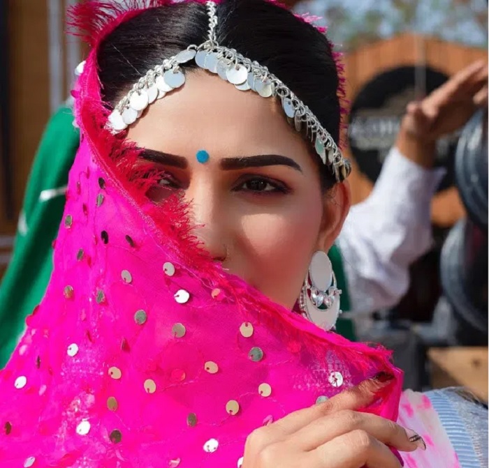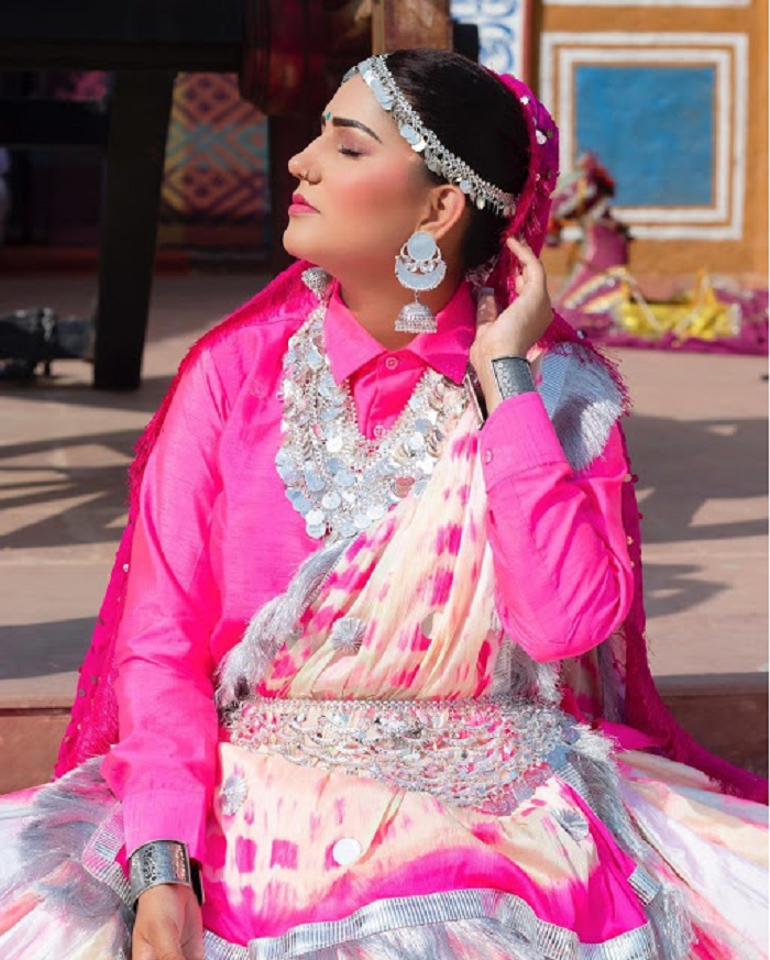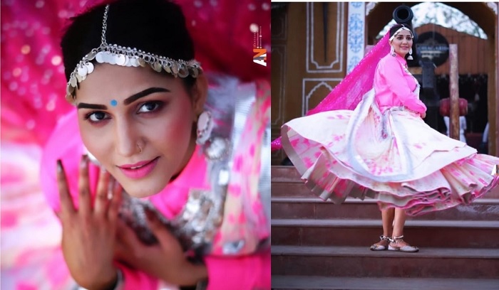 इन तस्वीरों में सपना बेहद ही खूबसूरत लग रही हैं। दरअसल, सपना ने इन तस्वीरों में हरियाणवी लुक (Haryanvi Look( अपनाया है। सपना ने पिंक एंड व्हाइट कलर का घाघरा चोली पहना है। साथ ही अपने सिर पर पल्लू किया है। सपना ने पिंक कलर के लहंगे के साथ स्काई ब्लू रंग की बिंदी भी लगाई है।