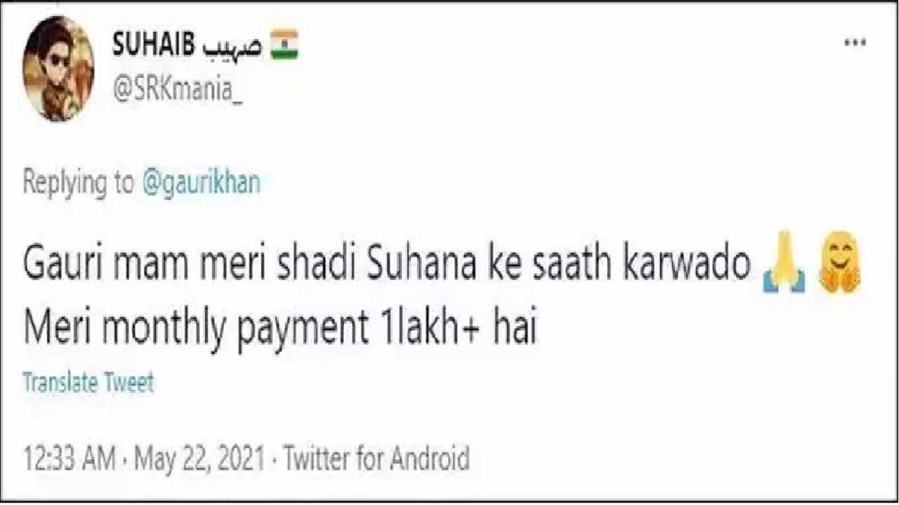 बता दे की सुहैब नाम के यूजर ने सुहाना की फोटो देख खुद को काबू नहीं कर पाया. और कमेंट लिखते हुए कहता है की गौरी मैम मेरी शादी सुहाना से करवा दो मेरी सैलरी 1 लाख रूपए महीने है. भले ही सुहाना अभी बॉलीवुड में क़दम नहीं रखी है लेकिन उनके चाहने वालो की संख्या में तेजी से इजाफा हो रहा है.
