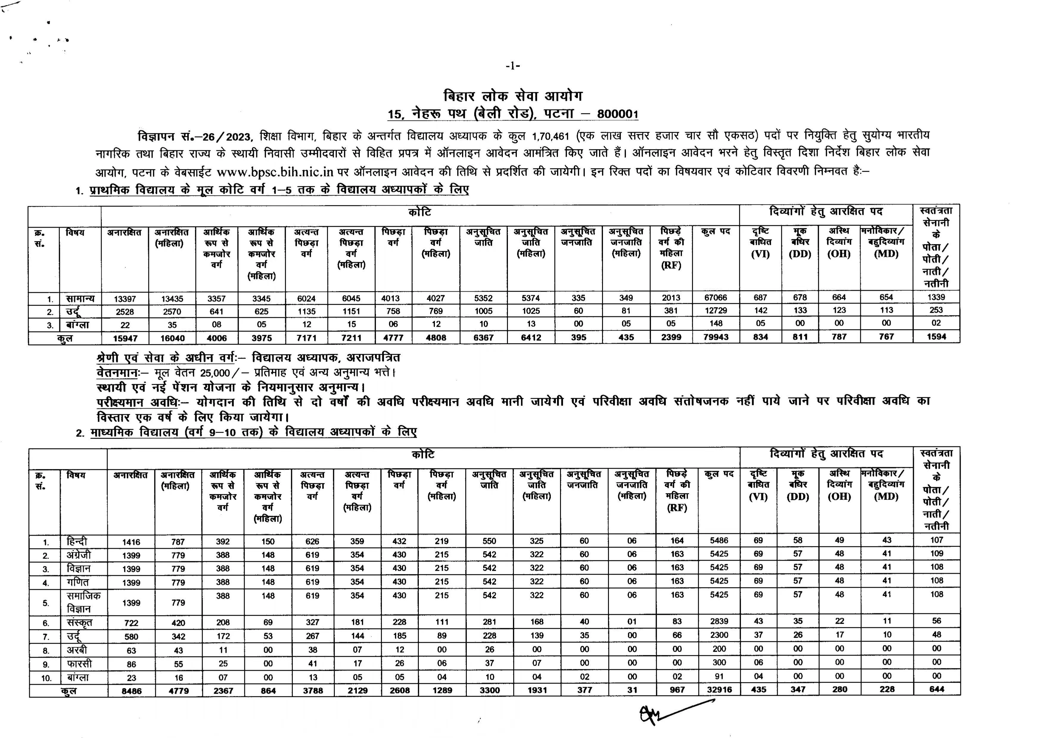 नोट:- (i) प्राथमिक विद्यालय के मूल कोटि के विद्यालय अध्यापक तथा माध्यमिक एवं उच्च माध्यमिक विद्यालय के विद्यालय अध्यापक पद के लिए विषयवार आरक्षण रोस्टर समेकित रूप से आयोग के वेबसाईट www.bpsc.bih.nic.in पर उपलब्ध है। (ii) विज्ञापित रिक्तियों की संख्या औपबंधिक है, जो घट-बढ़ सकती है।