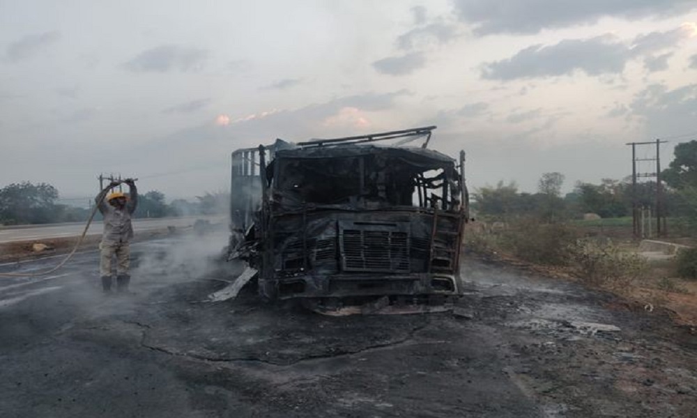 कटनी। राष्ट्रीय राजमार्ग 30 में तेज रफ्तार दौड़ रहे ट्रक का अचानक टायर फट जाने के कारण अनियंत्रित हुआ ट्रक पुलिया से टकरा गया जिससे ट्रक में आग भड़क उठी और देखते ही देखते ट्रक धू-धूकर जलने लगा। आग की लपटे इतनी तेज थी कि लगभग दो किलोमीटर दूर तक दिखाई दे रहीं थीं। घटना के करीब एक घंटे बाद पहुंची फायर बिग्रेड की टीम काफी मशक्कत के बाद आग पर काबू पाया लेकिन तब तक ट्रक जलकर खाक हो चुका था। वहीं ट्रक को आग से घिरा देख ड्राइवर एवं क्लीनर कूदकर अपनी जान बचाई। घटना में 1.30 लाख रुपये नकद सहित ट्रक जलकर खाक हो गया है।