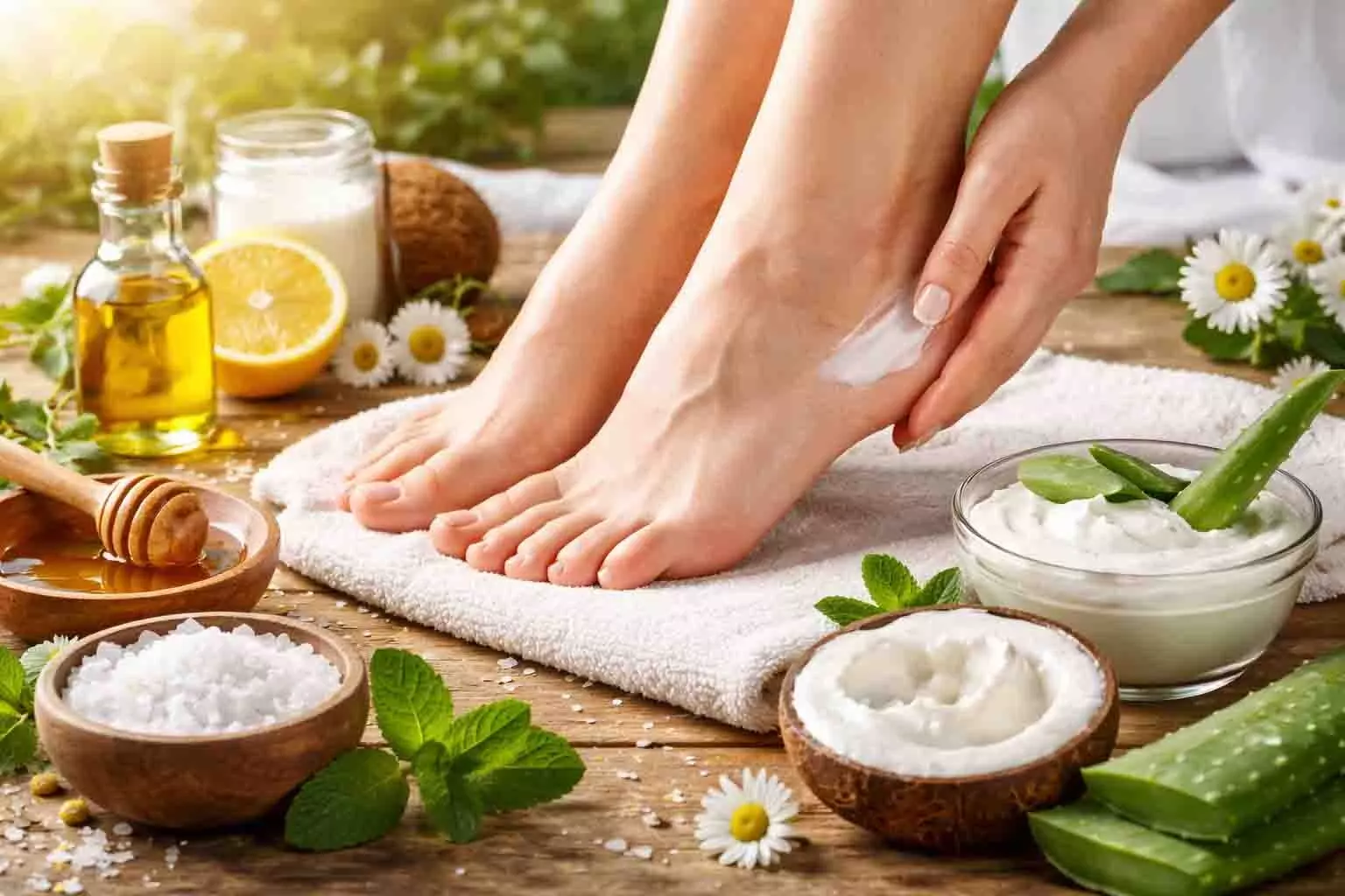 अगला महत्वपूर्ण कदम है एक्सफोलिएशन। Dead skin removal tips को ध्यान में रखते हुए प्यूमिक स्टोन का इस्तेमाल करें। याद रहे कि एड़ियों को बहुत जोर से न रगड़ें, वरना जख्म हो सकते हैं। स्क्रबिंग के बाद पैरों को ठंडे पानी से धोकर अच्छे से सुखा लें। अब किसी अच्छी क्वालिटी के best moisturizer for feet का इस्तेमाल करें। अगर आप प्राकृतिक चीजों को पसंद करते हैं, तो एलोवेरा जेल भी लगा सकते हैं। Ayurvedic treatment for feet में तिल का तेल भी बहुत फायदेमंद माना जाता है।
