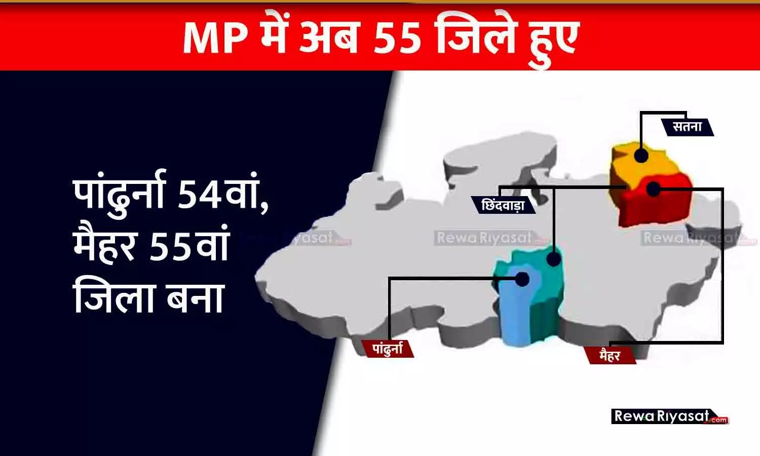 सतना. मध्य प्रदेश अब 55 जिलों का हो गया है. कैबिनेट से अनुमोदन के बाद राजस्व विभाग ने गुरुवार सुबह पांढुर्ना को 54वां और मैहर को 55वां जिले बनाने का आदेश जारी कर दिया. छिंदवाड़ा से टूटकर बने पांढुर्ना जिले में दो तहसील और सतना से अलग होकर बने मैहर में तीन तहसील होंगी. रानी बाटड को मैहर और अजयदेव शर्मा को पांढुर्ना का पहला कलेक्टर बनाया. नागदा को जिला बनाने की घोषणा की गई है, लेकिन स्थानीय विरोध ने इसे फिलहाल अटका दिया है. इस चुनावी मौसम में सरकार ने 3 नए जिले गठित किए हैं.