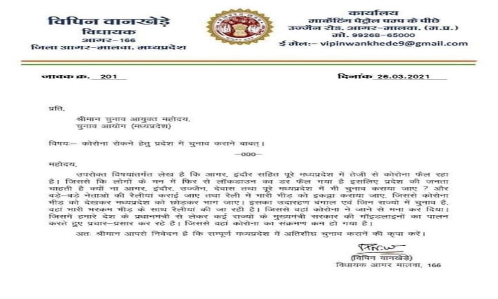 भोपाल। देश के साथ ही मध्यप्रदेश में तेजी से बढ़ रहे कोरोना संक्रमण के बीच तरह-तरह की बातें सामने आने लगी हैं। आगर-मालवा से विधायक विपिन वानखेड़े ने चुनाव आयुक्त को पत्र लिखकर कोरोना रोकने हेतु प्रदेश में चुनाव कराने की मांग की है।