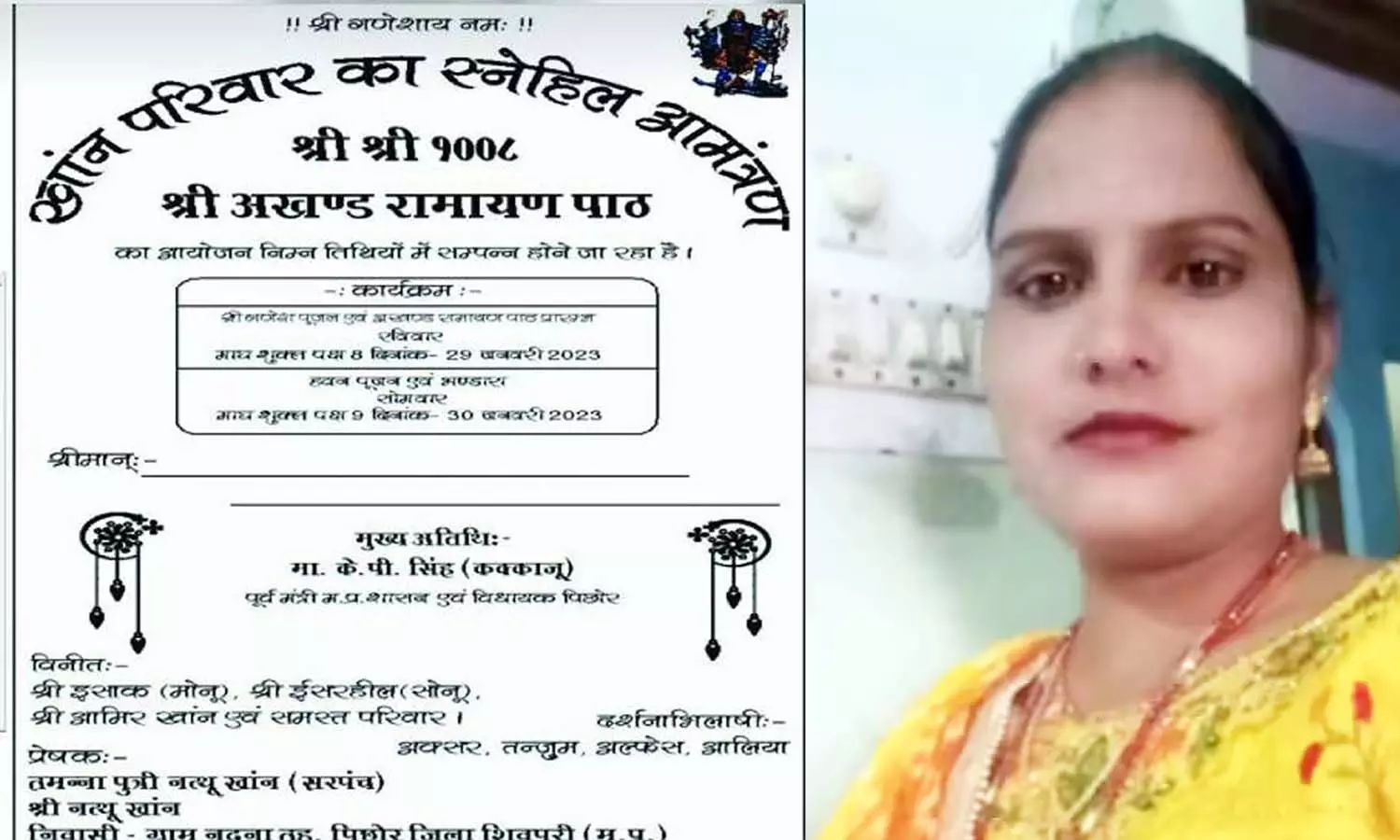 शिवपुरी जिले के पिछोर जनपद के नंदना गांव से हिंदू-मुस्लिम एकता का अनूठा उदाहरण सामने आया है। बताया गया है कि नंदना-पिपरोनिया पंचायत से पहली बार चुनी गईं मुस्लिम सरपंच ने काली माता के मंदिर पर अखंड रामायण के पाठ का आयोजन रखा है। यह पाठ 29 जनवरी से प्रारंभ भी हो गया है। खान परिवार द्वारा अखंड रामायण पाठ में शामिल होने के लिए लोगों को निमंत्रण कार्ड भी छपवाकर भेजा गया है जिसमें सबसे ऊपर श्री गणेशाय नमः छपवाया गया है। अखंड रामायण पाठ का आमंत्रण पत्र सोशल मीडिया पर खूब वायरल हो रहा है जिसकी लोगों द्वारा प्रशंसा की जा रही है।