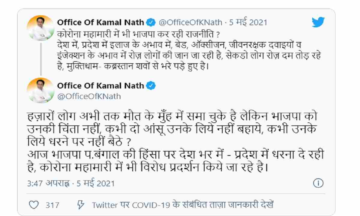 कमलनाथ ने आगे कहा की भाजपा सरकार ने एक भी दिन कोरोना संक्रमितों के लिए आंसू नहीं बहाए और न ही कोई शोक संवेदना व्यक्त की. शिवराज सरकार सिर्फ नौटंकी कर रही है. कमलनाथ ने आगे कहा की कितने मरीज अस्पतालों में जीवनरक्षक दवाइयों व इंजेक्शन, बेड, ऑक्सीजन के अभाव से दम तोड़ रहे है. और शिवराज सरकार बंगाल चुनाव के गम में डूबी हुई है.