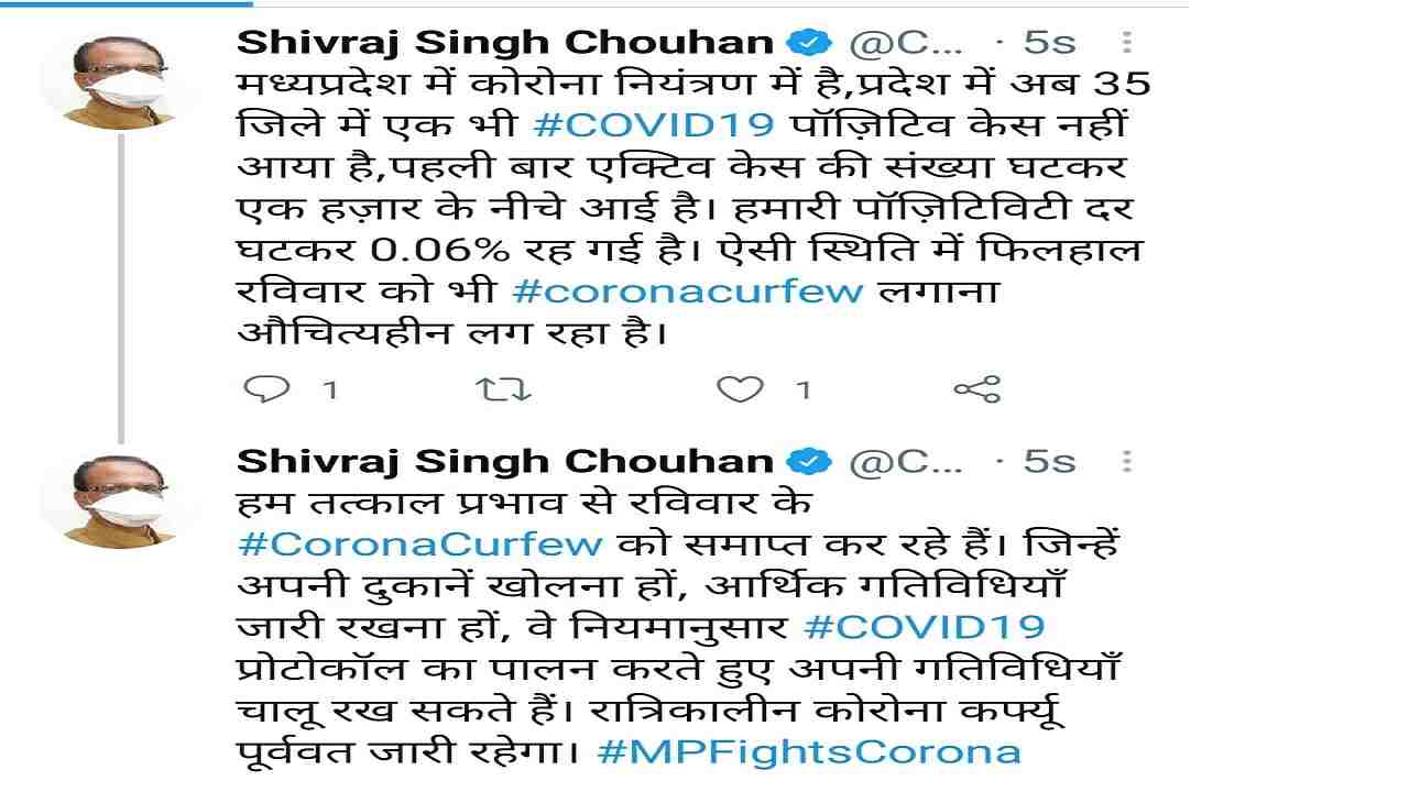 बता दे की शिवराज सिंह चौहान ने आज ट्वीटर में ट्वीट करते हुए लिखा की मध्यप्रदेश के 35 जिलों में एक भी कोरोना केस नहीं आये है. साथ में पहली बार प्रदेश में 1 हजार से कम संक्रमित आये है. हमारी पॉजिटिव रेट 0.06 प्रतिशत हो गई है. ऐसे में रविवार को कोरोना संक्रमण हटाना ही उचित होगा।