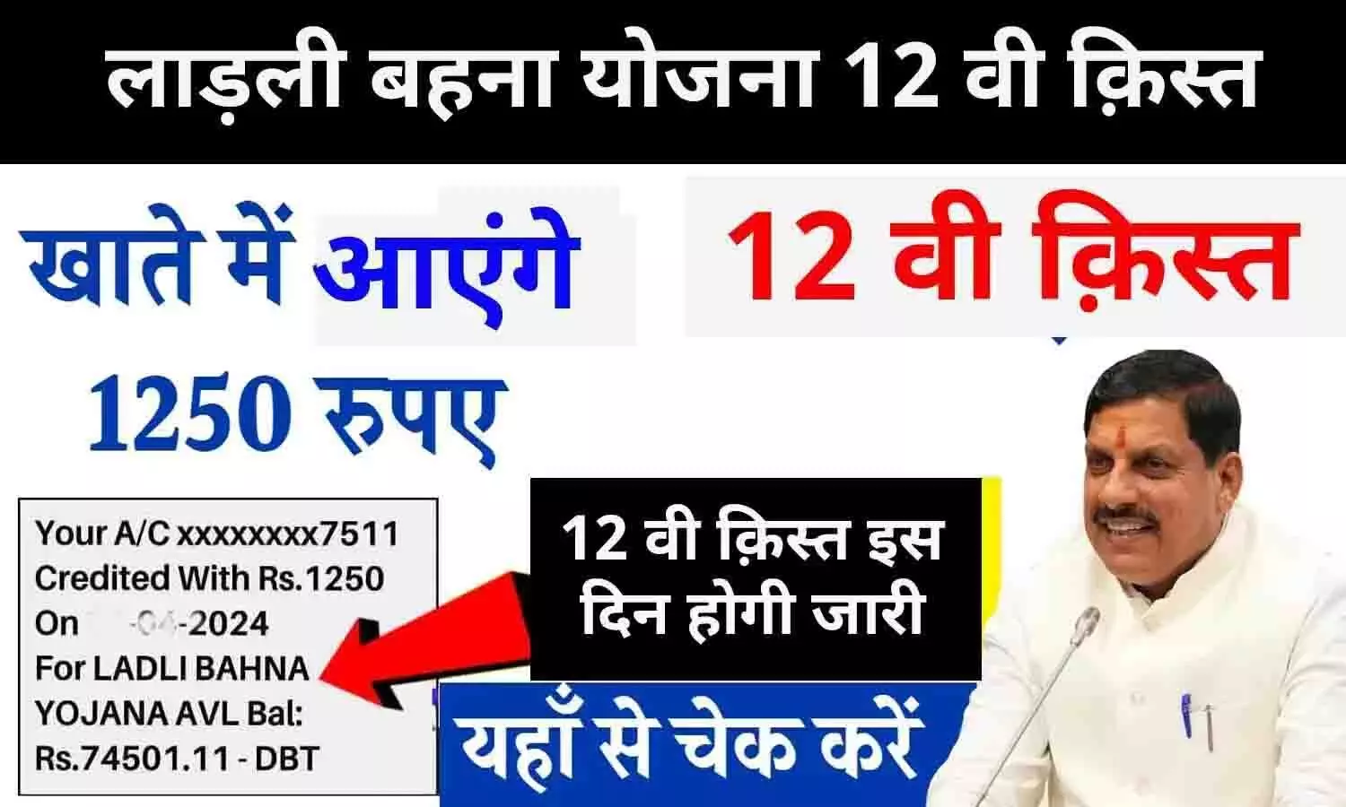 Ladli Behna Yojana 12th Installment 2024: लाडली बहना योजना 12वीं किस्त 2024 मध्य प्रदेश सरकार के द्वारा राज्य की सभी महिलाओं को लाडली बहना योजना के जरिये से आर्थिक सहायता प्रदान की जा रही है। इस योजना के तहत महिलाओं को हर माह 1250 रुपए की आर्थिक सहायता प्रदान की जाती है। अब सभी महिलाओं को इस योजना की 12वीं किस्त का इंतजार है। 12 वी क़िस्त को लेकर बड़ा अपडेट सामने आ गया है.
