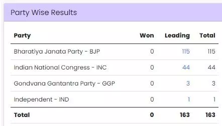 निर्वाचन आयोग की वैबसाइट में 230 में से 163 सीटों के आंकड़े सामने आए हैं। 115 सीटों में भाजपा तो 44 में कांग्रेस आगे चल रही है।