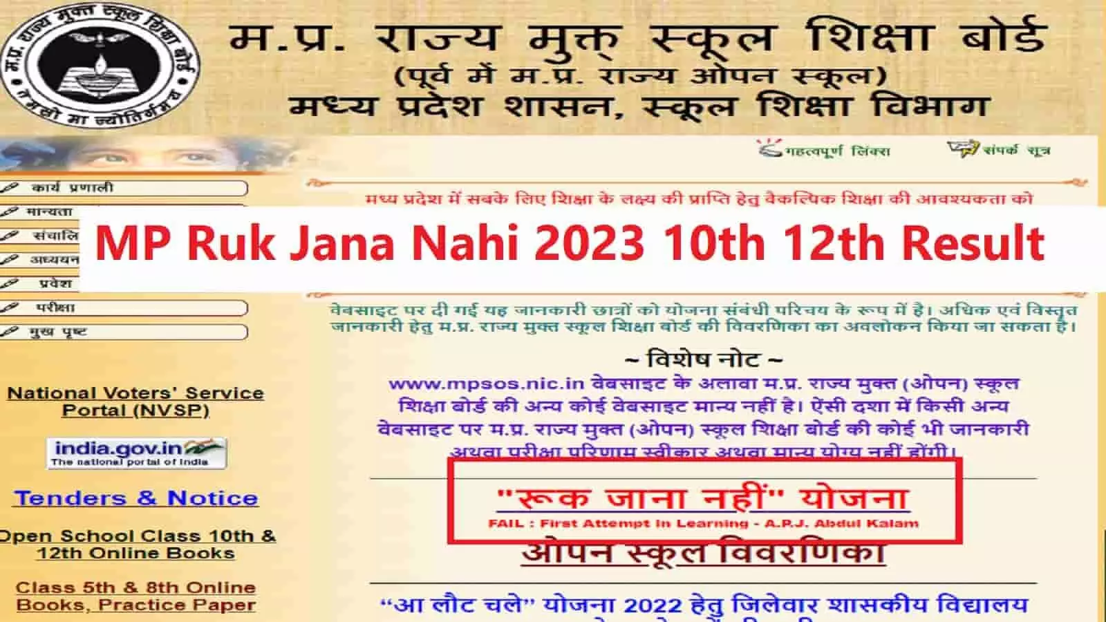 मीडिया रिपोर्ट्स के अनुसार आज यानि की गुरुवार 27 जुलाई को मध्य प्रदेश राज्य मुक्त स्कूल शिक्षा बोर्ड (MPSOS) MP Ruk Jana Nahi 2023 के परिणाम की घोषणा कर दी गई है। रिजल्ट जारी हो जाने के बाद दसवीं और बारहवीं के विद्यार्थी रोल नंबर के द्वारा अपना रिजल्ट डाउनलोड कर सकते है। बता दें की Ruk Jana Nahi Result 2023 एमपी राज्य मुक्त स्कूल शिक्षा बोर्ड (MPSOS) की ऑफिसियल वेबसाइट https://www.mpsos.nic.in/ पर घोषित किया जायेगा।