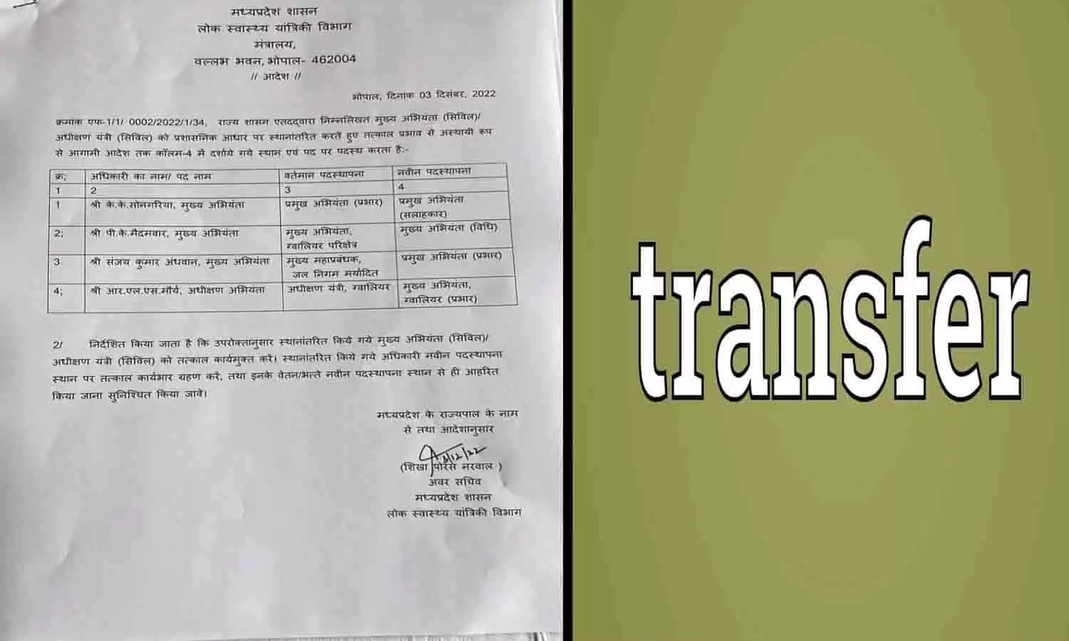 PHE Department Transfer 2022, MP Transfer 2022: मध्यप्रदेश शासन लोक स्वास्थ्य यांत्रिकी विभाग ने मुख्य अभियंता सहित चार अधीक्षण यंत्री स्थानांतरण कर दिया है। प्रशासनिक व्यवस्था दुरुस्त करने लोक स्वास्थ्य यांत्रिकी विभाग द्वारा यह निर्णय लिया गया है। इस संबंध में अवर सचिव मध्यप्रदेश शासन लोक स्वास्थ्य यांत्रिकी विभाग सीखा पोरस नरवाल ने आदेश जारी किया है। जारी की गई सूची में तीन मुख्य अभियंता और एक अधीक्षण अभियंता का नाम शामिल है।