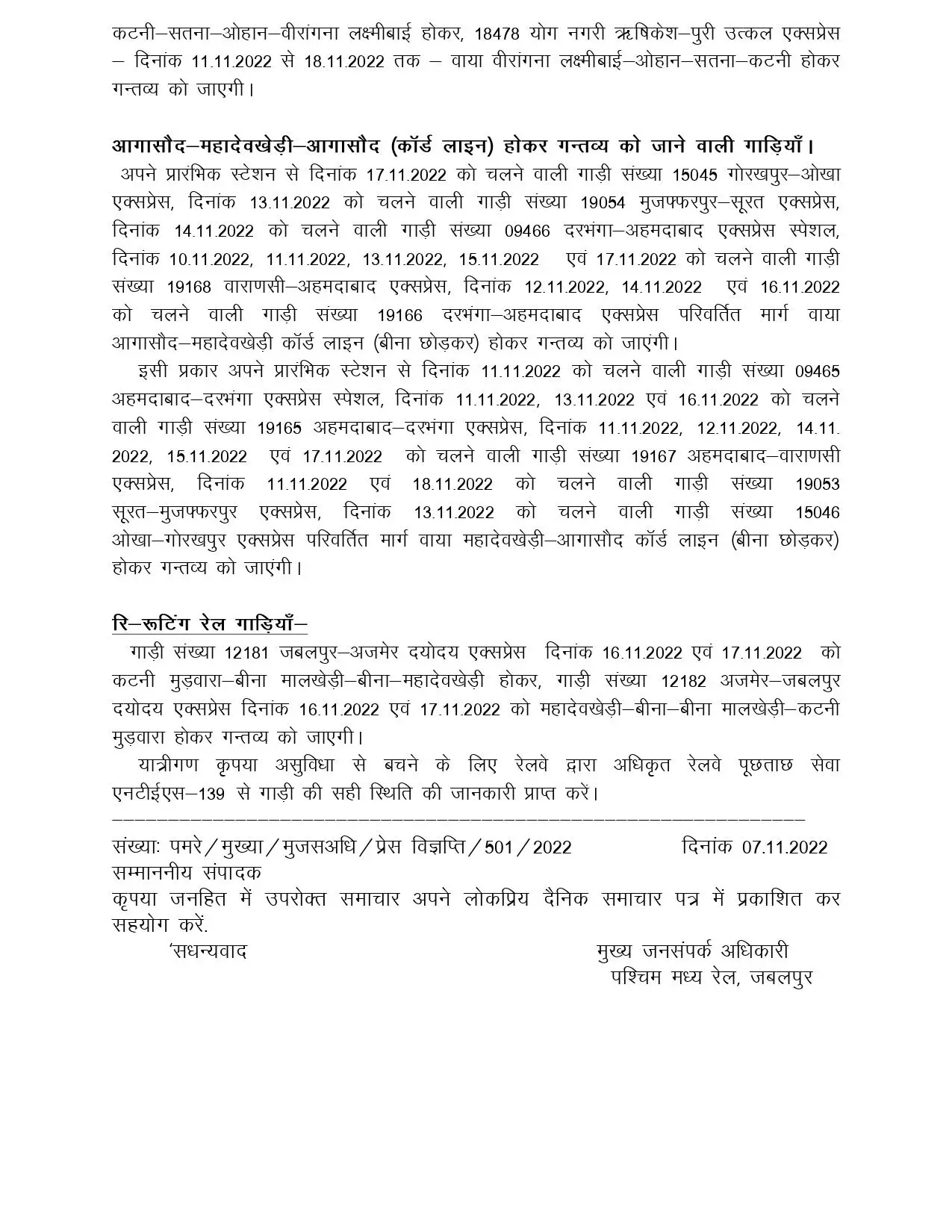 नॉन इंटरलॉकिंग कार्य के चलते कुछ गाड़ियाँ निरस्त व कुछ परिवर्तित मार्ग से चलेंगी