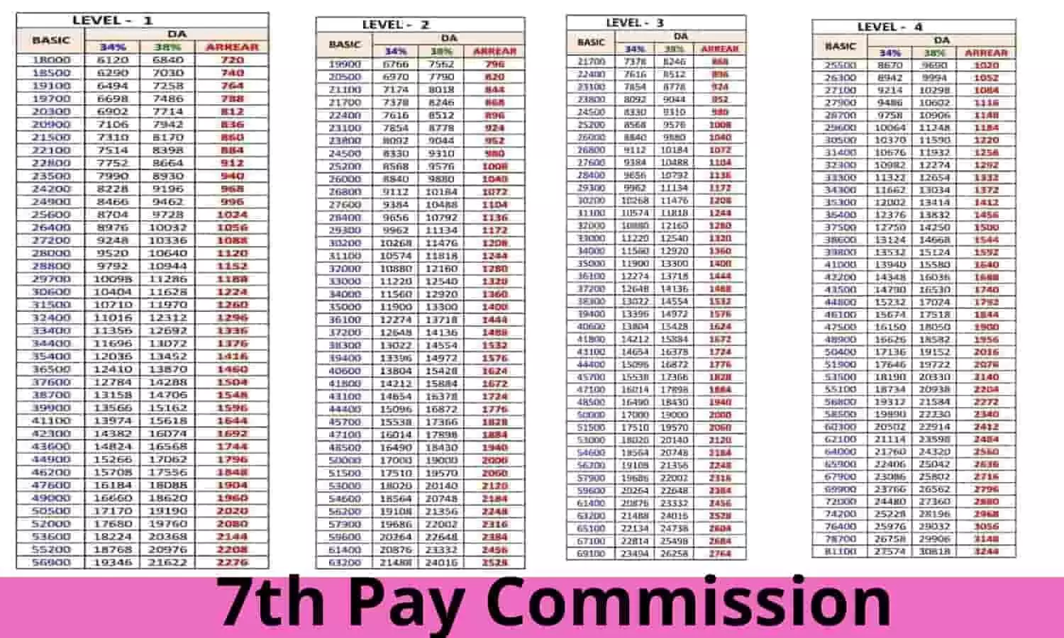 7th pay commission pay matrix महंगाई भत्ते में 4 प्रतिशत की बढ़ोतरी की गई है। जिससे अब डीए 34 प्रतिशत से बढ़कर 38 प्रतिशत हो गया है। डीए के भुगतान में हुई देरी की वजह से कर्मचारियों को एरिया भुगतान किया जा रहा है। जहां पहले ही बताया गया है कि कुछ कर्मचारियों को सितंबर की सैलरी में तो कुछ को अक्टूबर की सैलरी में भुगतान किया जाएगा।