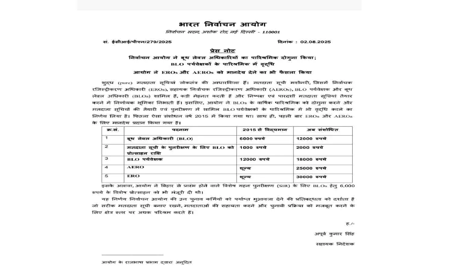 आयोग द्वारा जारी प्रेस नोट के अनुसार, यह वृद्धि उन कर्मयोगियों को पर्याप्त मुआवजा देने की प्रतिबद्धता को दर्शाती है जो सटीक मतदाता सूची बनाने, मतदाताओं की सहायता करने और चुनावी प्रक्रिया को मजबूत करने के लिए निचले स्तर पर अथक परिश्रम करते हैं।