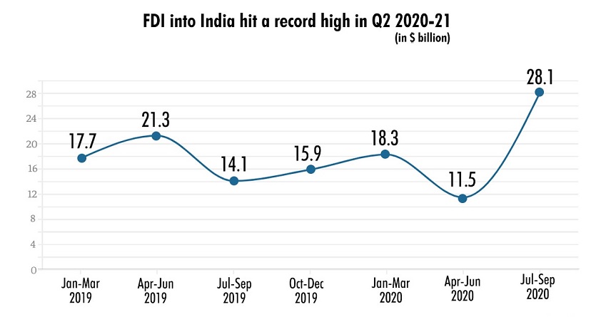 2020-21 के पहले दस महीनों में एफडीआई इक्विटी प्रवाह यूएस $ 54.18 बिलियन की तुलना में 2019-20 के पहले दस महीनो की अवधि में यूएस $ 42.34 बिलियन है जो 28% की बढ़त दर्शाता है। चालू वित्त वर्ष 2020-21 के पहले दस महीनों में शीर्ष निवेशक देशों के संदर्भ में, 'सिंगापुर' 30.28% के एफडीआई इक्विटी प्रवाह के साथ शीर्ष पर है, संयुक्त राज्य अमेरिका (24.28) के साथ दूसरे स्थान पर और यूएई (7.31%) तीसरे स्थान पर है।