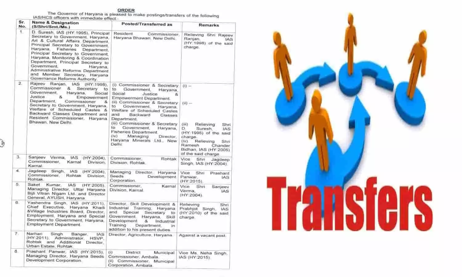 IAS Transfer 2022, IAS Transfer December 2022: प्रशासनिक कसावट लाने हरियाणा सरकार ने IAS एवं HCS अधिकारियों के लिए ट्रांसफर लिस्ट जारी की है। कुछ अधिकारियों को अतिरिक्त प्रभार भी दिया गया है। जानकारी के अनुसार सरकार ने शुक्रवार को तत्काल प्रभाव से आईएएस अफसरों के तबादले की लिस्ट जारी की है। समाचार में नीचे ट्रांसफर की लिस्ट भेजी गई है।