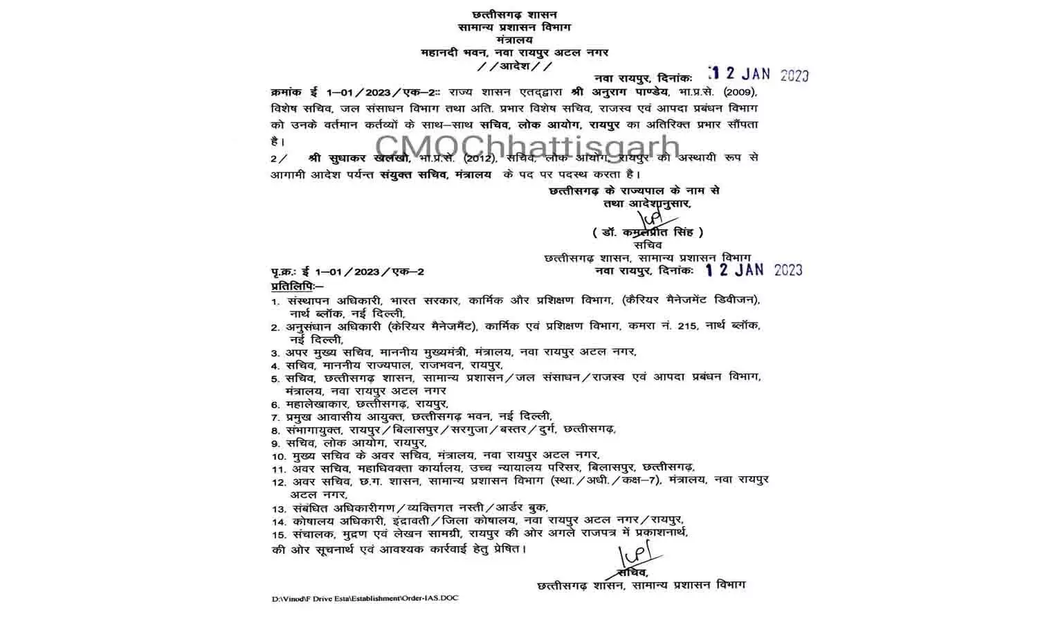 आईएएस अनुराग पांडे को सचिव , जल संसाधन विभाग और अतिरिक्त प्रभार, विशेष सचिव राजस्व और आपदा प्रबंधन विभाग को सचिव लोकायुक्त रायपुर का अतिरिक्त प्रभार सौंपा गया है।