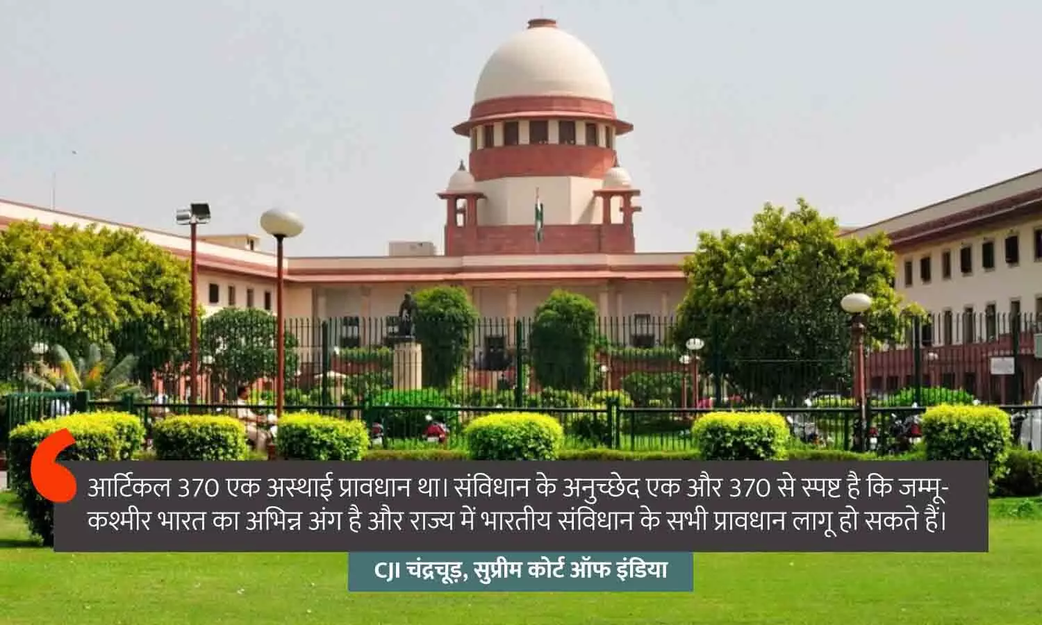 सीजेआई चंद्रचूड़ ने कहा- "आर्टिकल 370 एक अस्थाई प्रावधान था। संविधान के अनुच्छेद एक और 370 से स्पष्ट है कि जम्मू और कश्मीर भारत का अभिन्न अंग है और राज्य में भारतीय संविधान के सभी प्रावधान लागू हो सकते हैं।"