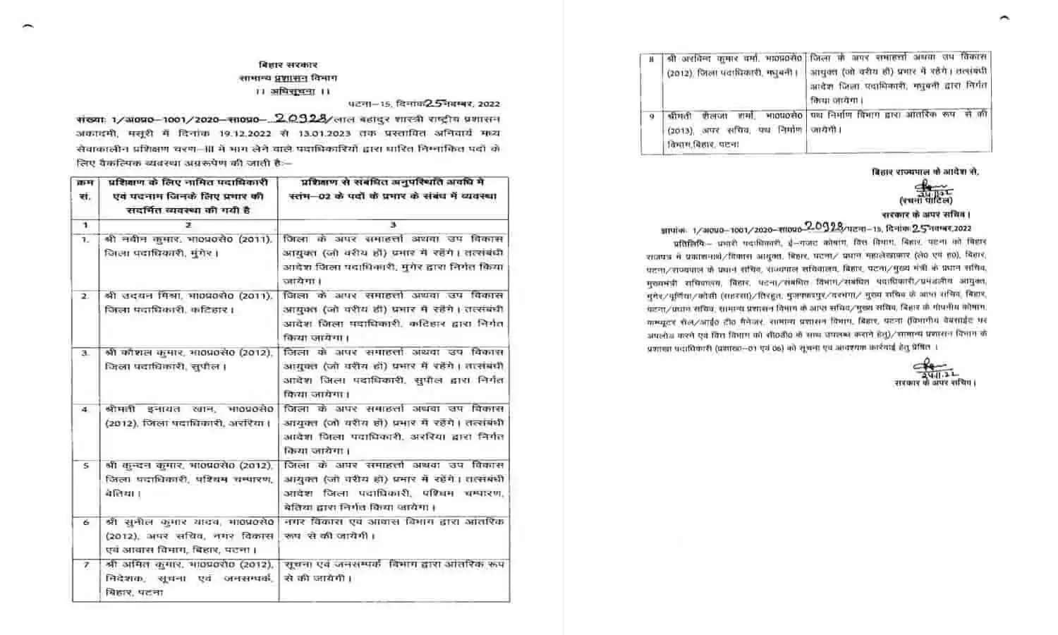 Bihar IAS Transfer 2022: राज्य के प्रशासनिक सेवा के 9 अधिकारियों को अतिरिक्त प्रभार एवं पदनाम की उपलब्धि मिली है। इसके लिए सामान्य प्रशासन विभाग के द्वारा सूची जारी कर दी गई है। जिससे उक्त अधिकारियों की बल्ले-बल्ले है। वे एक साथ दूसरे पदों पर भी अब काम कर सकेगे, यानि की एक साथ दूसरें विभागों पर भी अधिकारियों को नियंत्रण रहेगा।