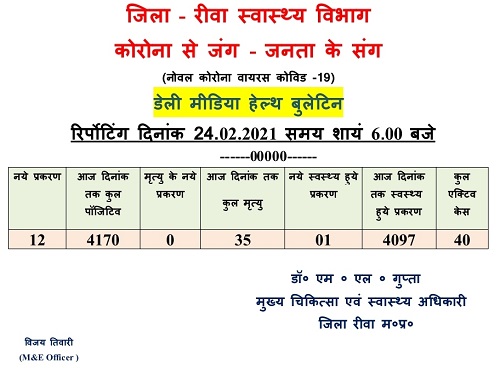रीवा के स्वास्थ्य विभाग द्वारा जारी आंकड़ों के अनुसार बुधवार को जिले में 12 नए संक्रमित मिले हैं. मंगलवार तक जिले में कोरोना नियंत्रण में था, लेकिन बुधवार को अचानक से मरीजों की संख्या बढ़ गई, यह संख्या दहाई अंक होना जिले के लिए ठीक नहीं है. 12 नए मरीज मिलने के बाद जिले में कुल संक्रमितों की संख्या 4170 पहुंच गई है. इनमें से 4097 लोग पूरी तरह से स्वस्थ हो चुके हैं एवं 40 लोगों का इलाज जारी है, जबकि 35 लोगों की कोरोना के चलते मृत्यु हो गई है.